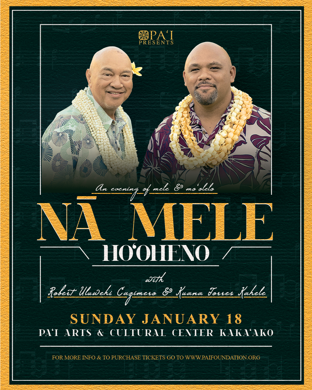 Join us for Nā Mele Hoʻoheno, an intimate evening of mele and moʻolelo with two of Hawaiʻi’s most beloved voices, Robert Uluwehi Cazimero and Kuana Torres Kahele. Together, they will share cherished mele—some familiar, some more recent—that celebrate aloha ʻāina, moʻokūʻauhau, and the beauty of our island home.